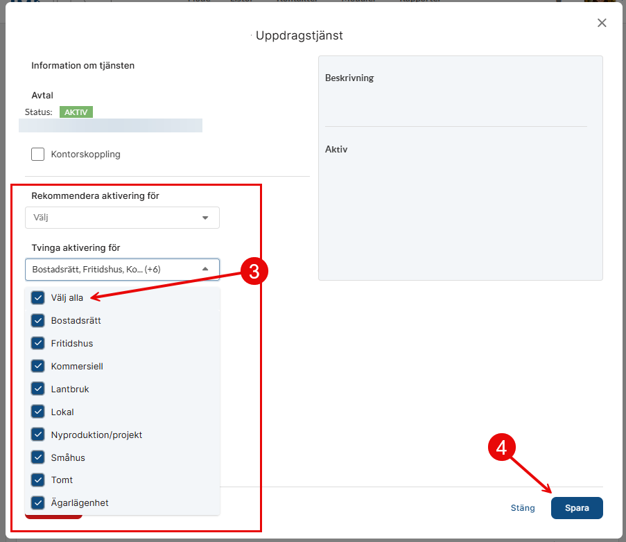 Om du vill att en tjänst ska vara aktiverad redan när ett uppdrag skapas kan du lägga till tvingande aktivering. Det finns även rekommenderad aktivering, som innebär att tjänsten föreslås som förvald vid uppstart men kan väljas bort.
